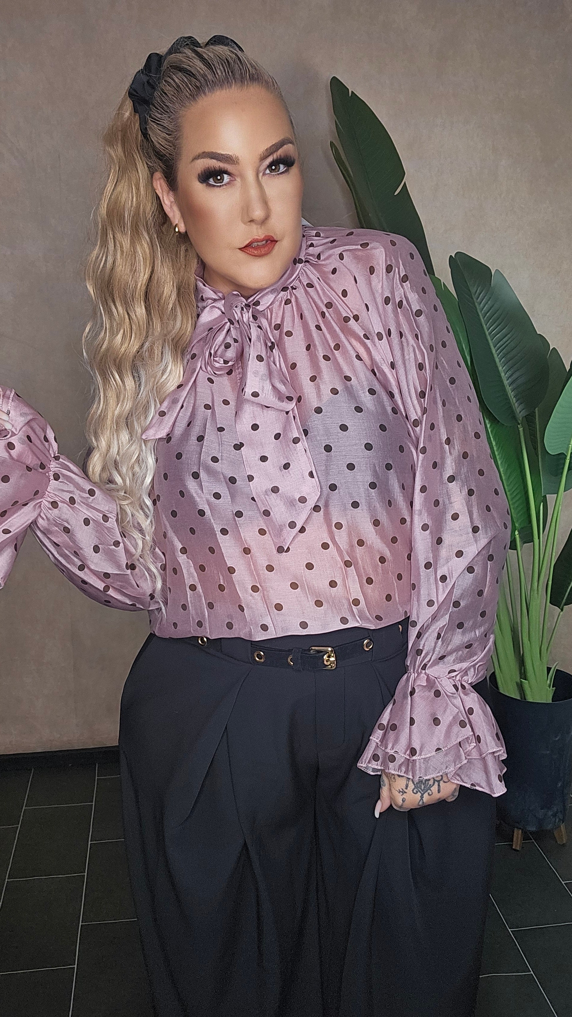 Diese elegante Bluse ChiffonLove in zartem Rosé mit schwarzen Punkten ist dein perfektes Statement-Piece für einen femininen, romantischen Look! Der luftige Chiffon-Stoff mit Polka Dots kombiniert mit der stylischen Schleife am Kragen und den Rüschendetails an den Ärmeln macht diese Bluse zum absoluten Hingucker. Perfekt für Curvy-Figuren von Größe 46 bis 52.