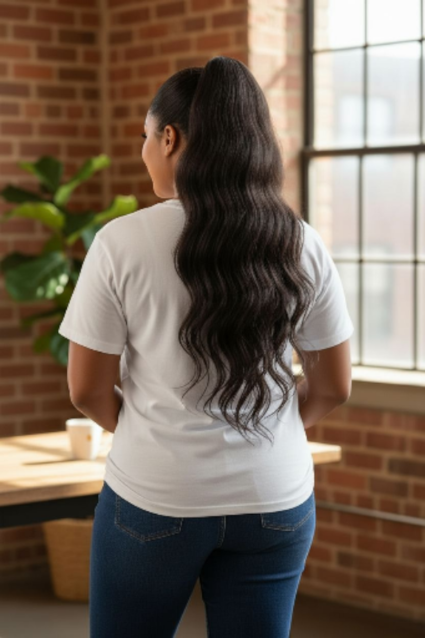 Definiere Luxus neu: Unser Deep Cacao Luxe Ponytail ist die Verkörperung von Eleganz und Fülle. Mit diesem voluminösen Haarteil erzeugst du einen tiefen, satten Braun-Look, der absolut fesselnd ist.
