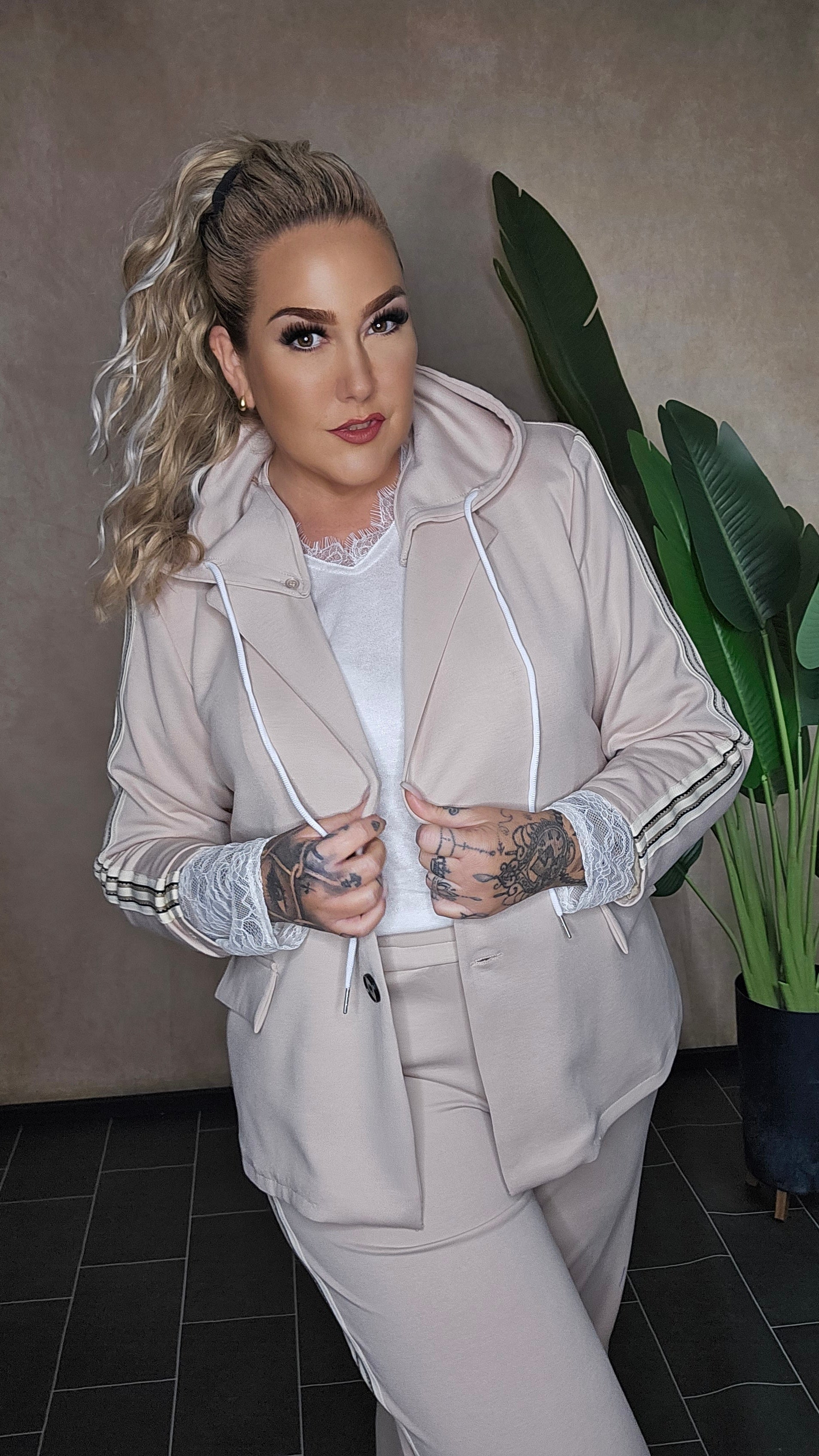 Diese bequeme Hose Sanja in elegantem Beige ist das perfekte Pendant zum Blazer Sanja! Aus hochwertigem Sweatstoff gefertigt, bietet sie dir maximalen Komfort mit stylischem Design. Dank des praktischen Gummizugs schlüpfst du einfach rein und genießt den ganzen Tag lang perfekten Sitz. Die sportlichen Streifen-Applikationen am Bein machen die Hose zum echten Hingucker.
