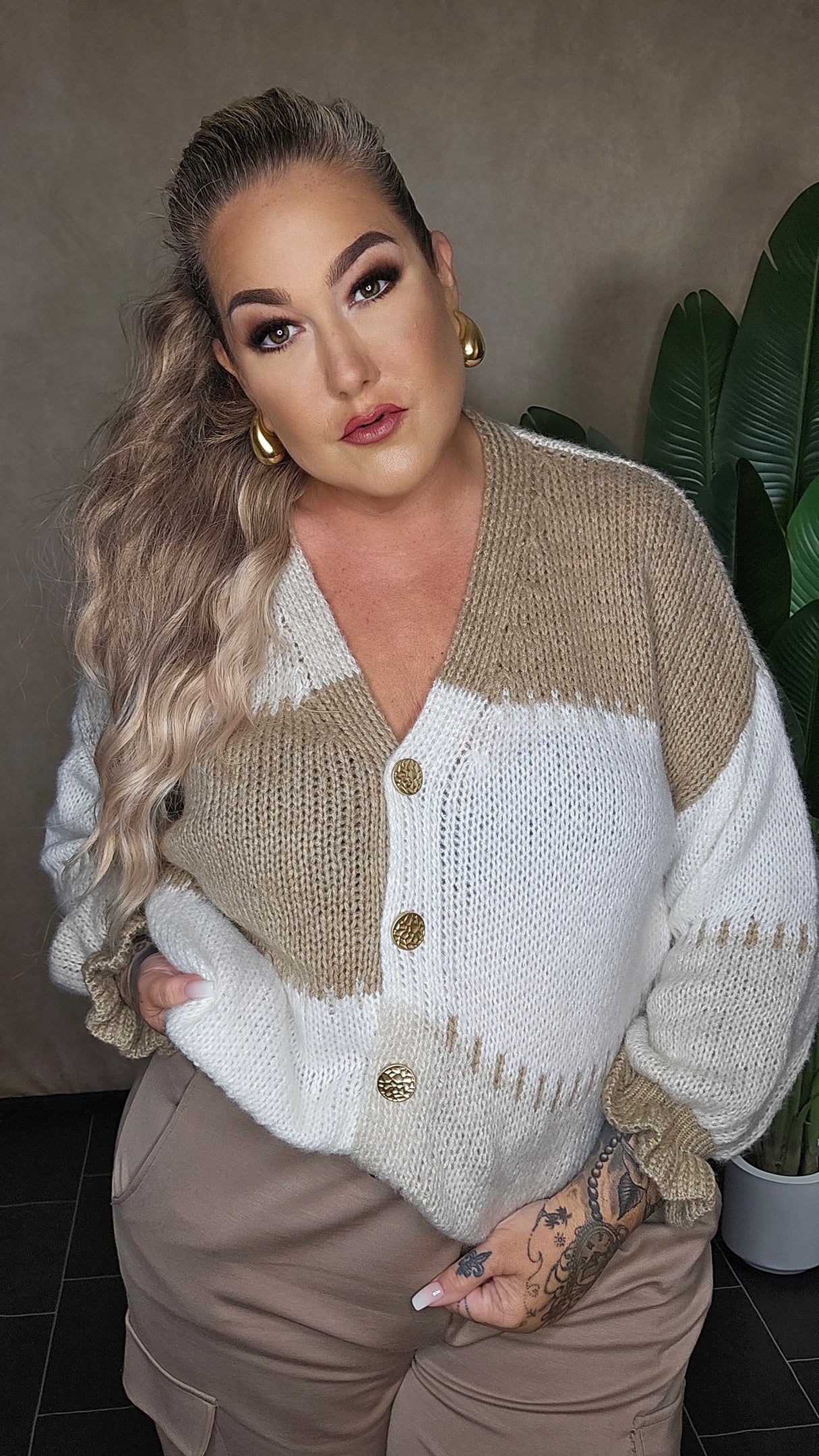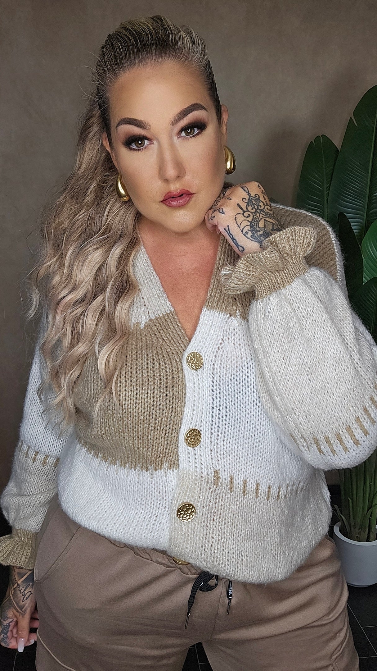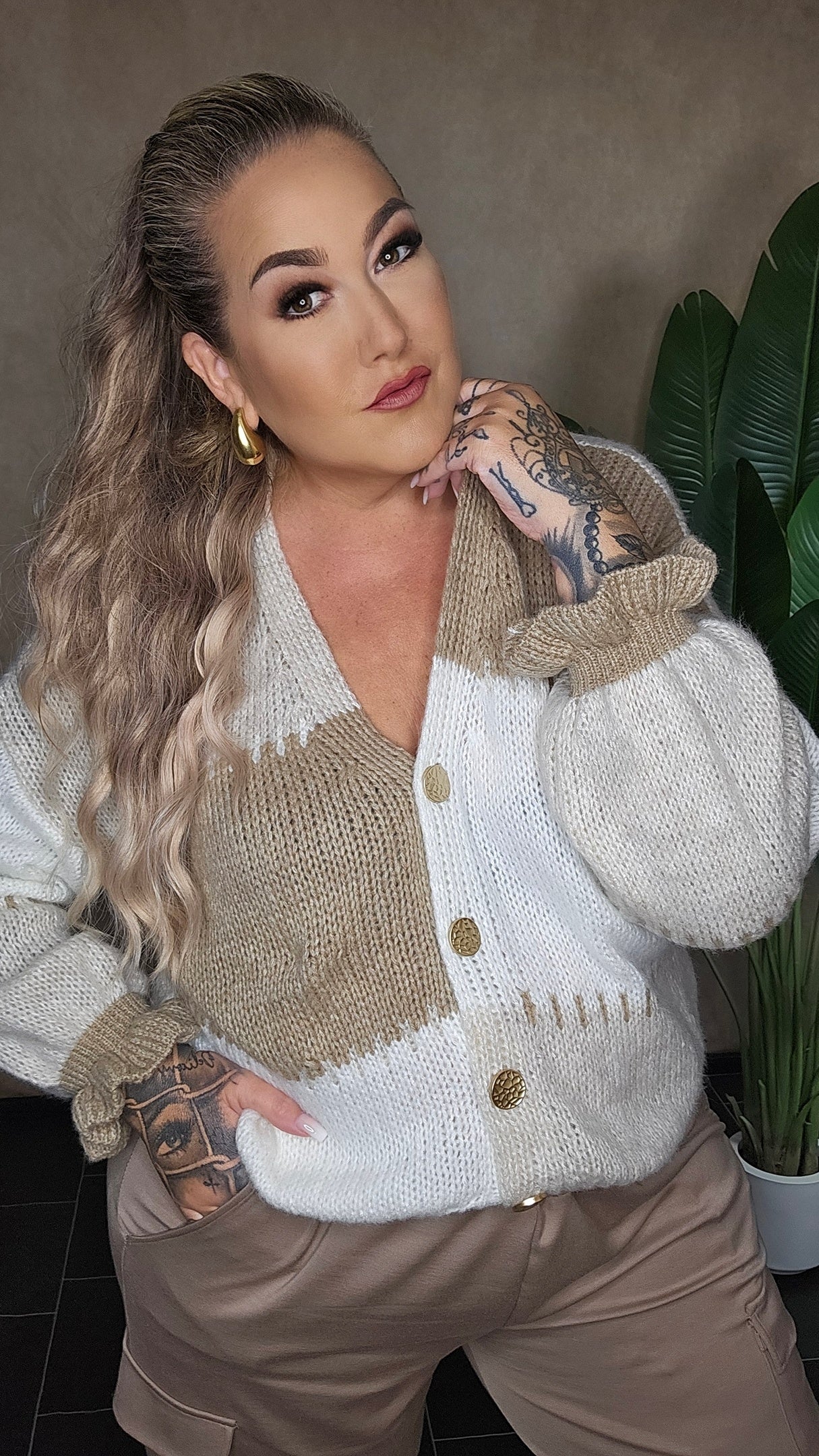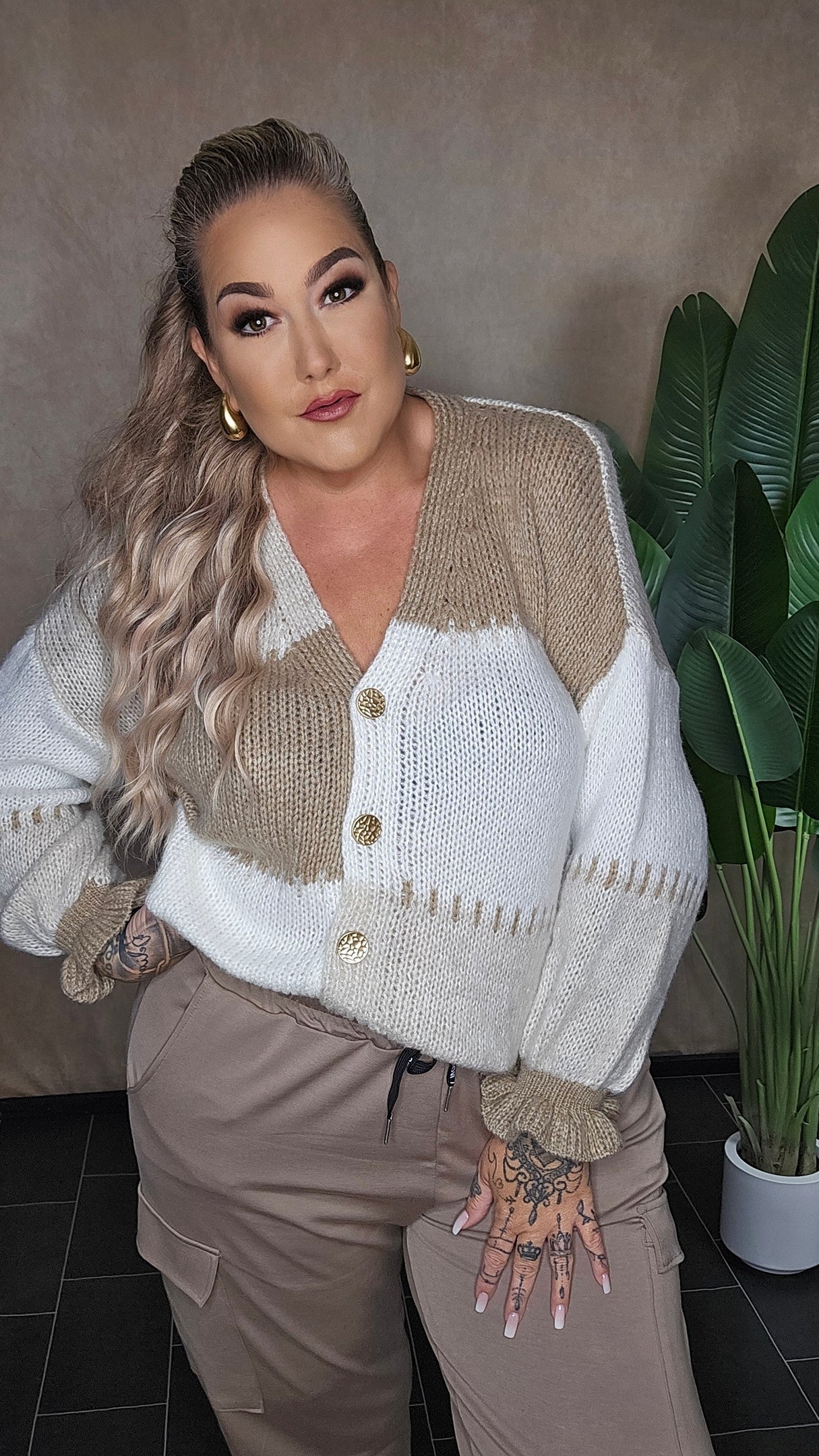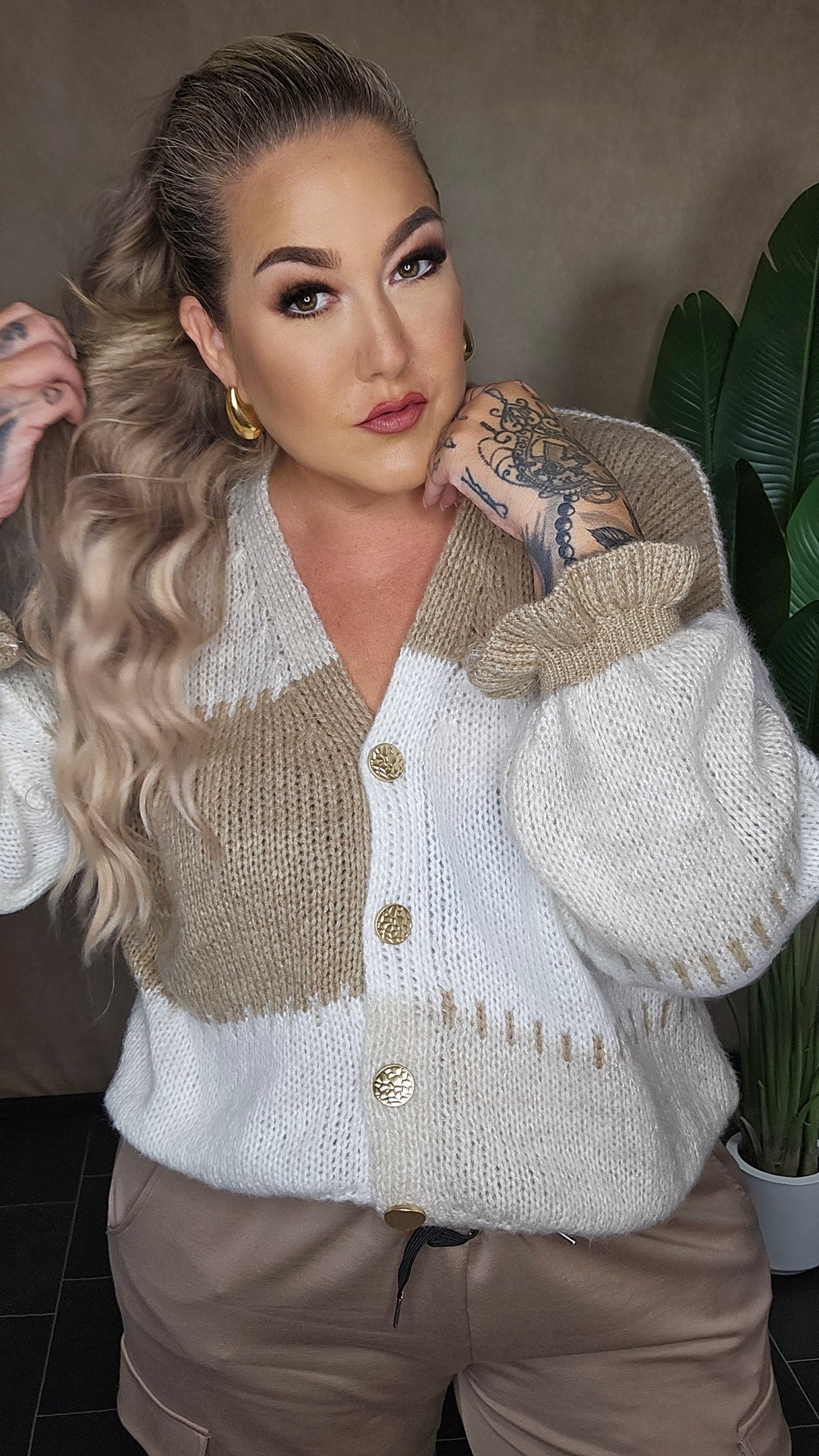Die Kombination aus warmem Beige, zartem Greige und hellem Braun macht diesen Cardigan zu einem vielseitigen Allrounder, der perfekt zu Jeans, Leggings oder einem schlichten Kleid passt. Er strahlt Ruhe und Eleganz aus und ist das ideale Key-Piece für deinen entspannten Herbst-Style.