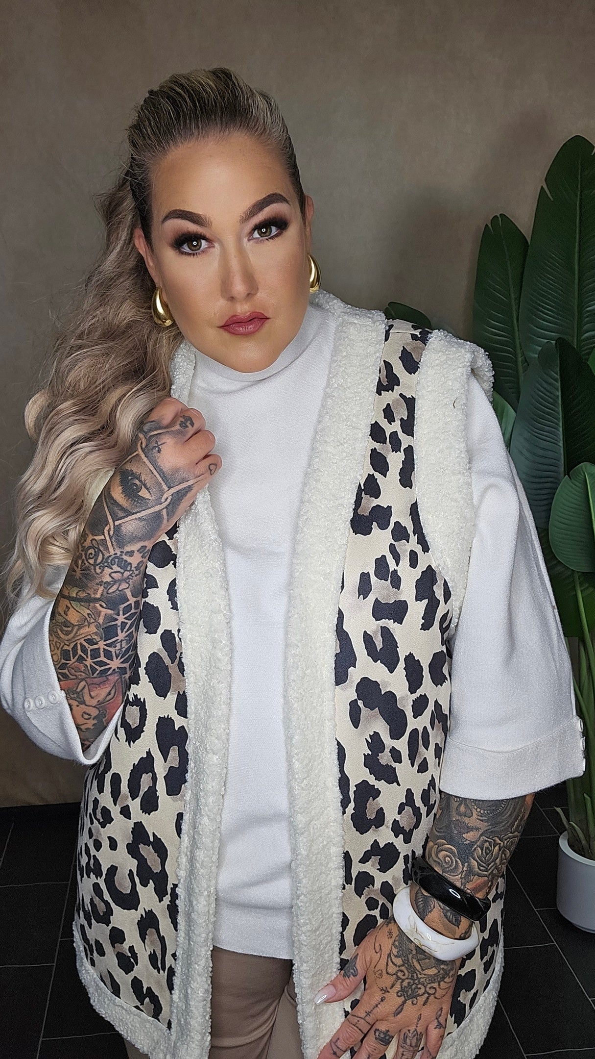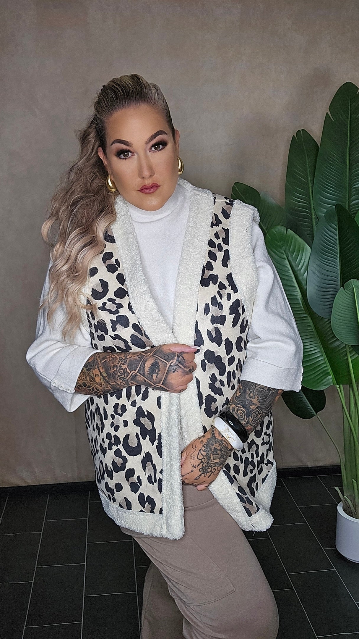 Mach dich bereit für den Herbst mit diesem absoluten Fashion-Highlight! Diese Oversize Kuschel-Weste im coolen Leo-Print ist die perfekte Mischung aus Gemütlichkeit und Style. Das flauschige Material fühlt sich unglaublich weich an und hält dich an kühlen Tagen schön warm, ohne aufzutragen.
