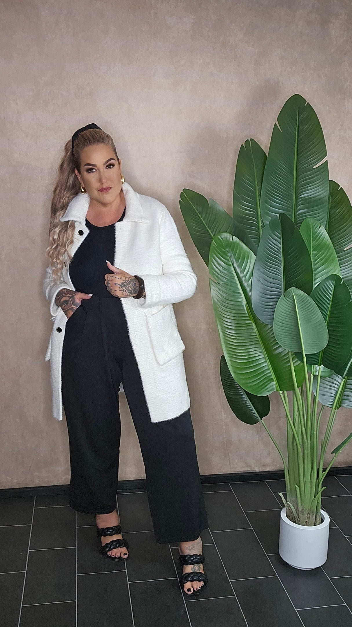 Die Jacke präsentiert sich in einem strahlenden Weiß, das jedem Outfit sofort Frische und Leichtigkeit verleiht. Ein besonderes Highlight ist ihr flauschiger Stoff, der nicht nur unglaublich angenehm auf der Haut liegt, sondern auch für eine stylische Textur sorgt. Die kontrastierenden schwarzen Knöpfe setzen einen markanten Akzent, der das klare Design unterstreicht und einen modernen Twist hinzufügt.