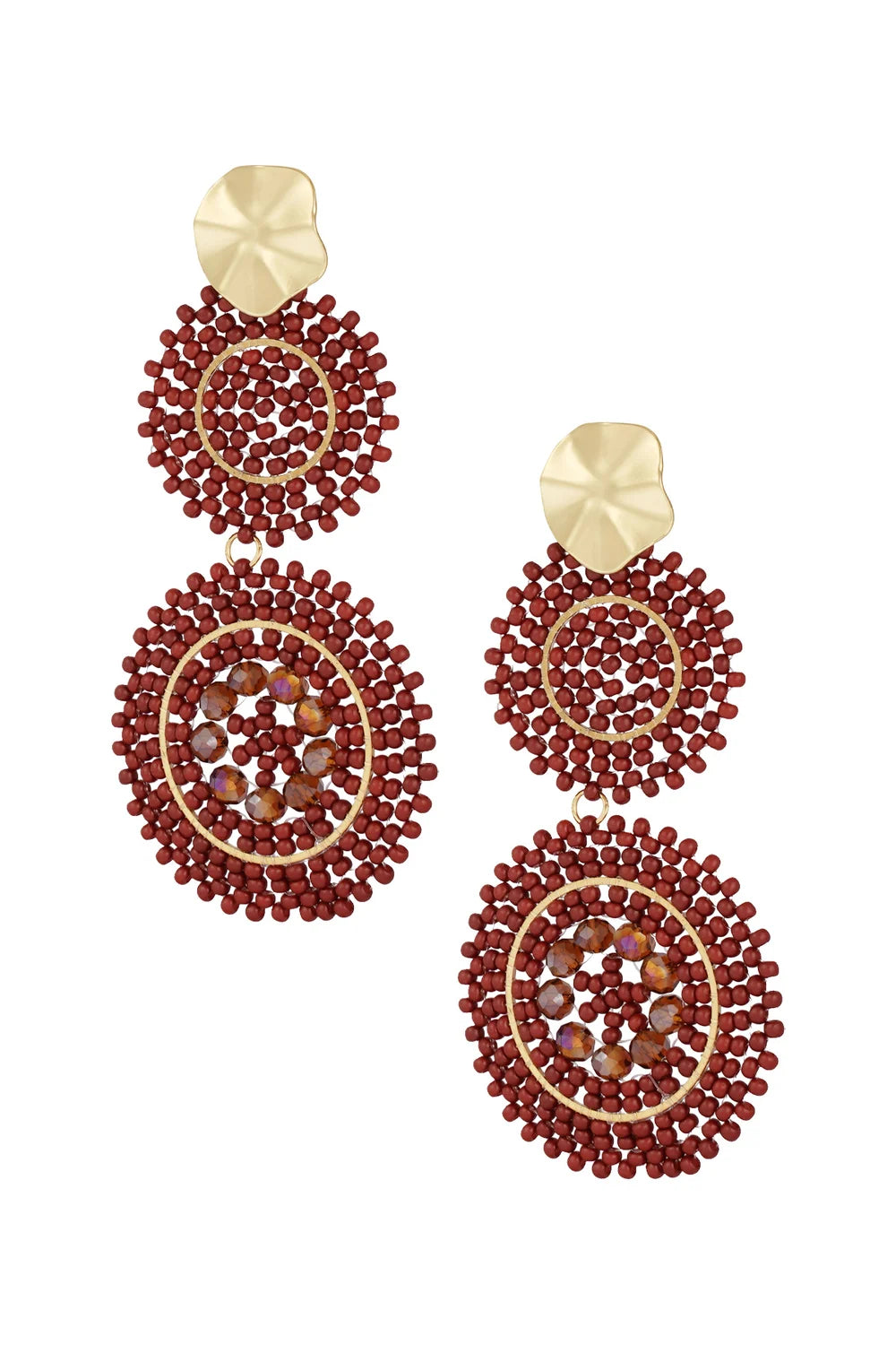 Das obere Element ist ein kleinerer Kreis, der vollständig mit winzigen, glänzenden roten Glasperlen umwickelt ist, die in einer präzisen Anordnung eine faszinierende Textur schaffen. Das untere, größere Kreiselement wiederholt dieses Muster der roten Glasperlen und wird zusätzlich durch funkelnde, facettierte Kristallperlen in warmen Bernstein- und Brauntönen ergänzt. Diese schimmernden Akzente fangen das Licht wunderbar ein und verleihen den Ohrringen eine besondere Tiefe und Brillanz.