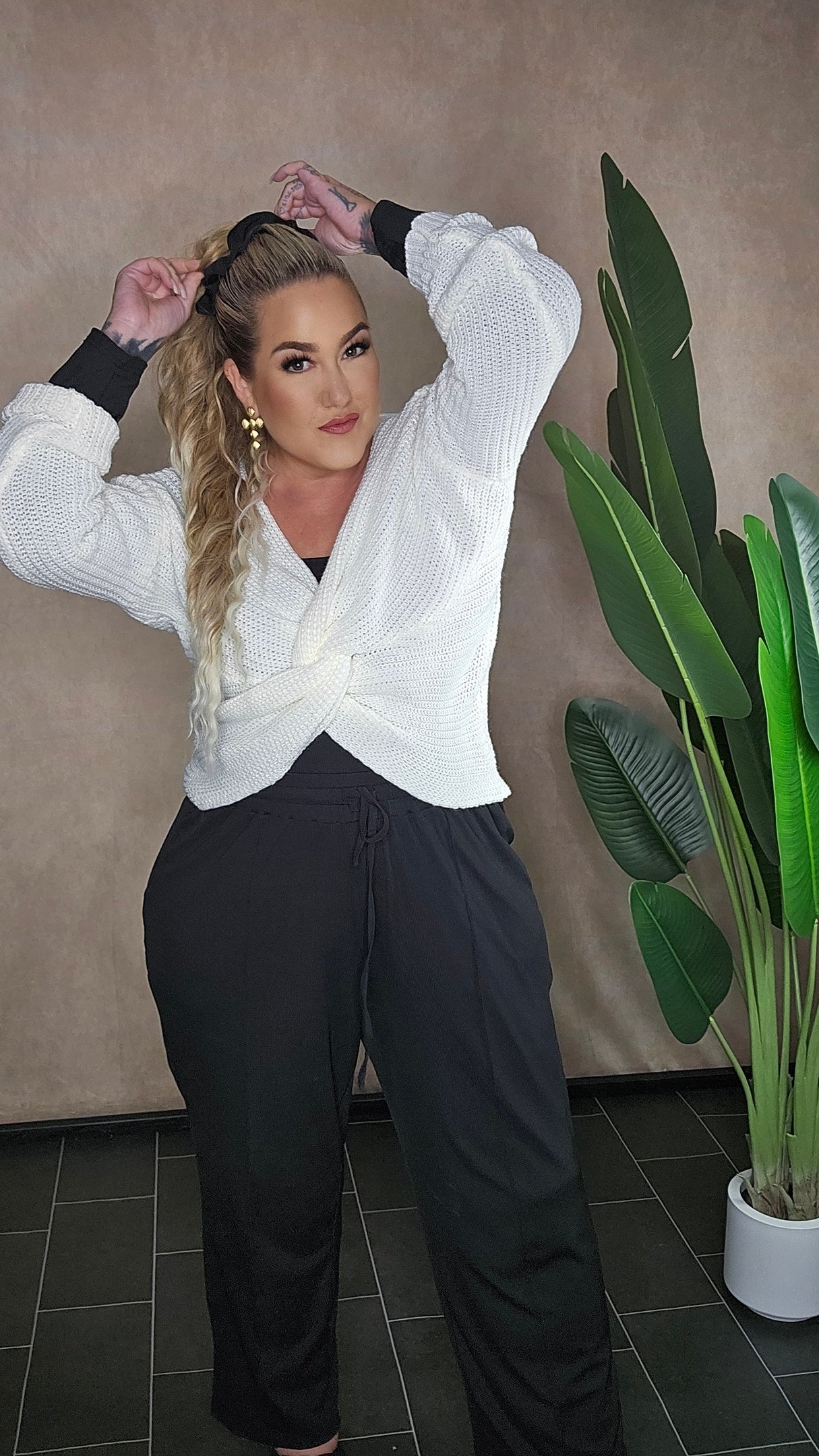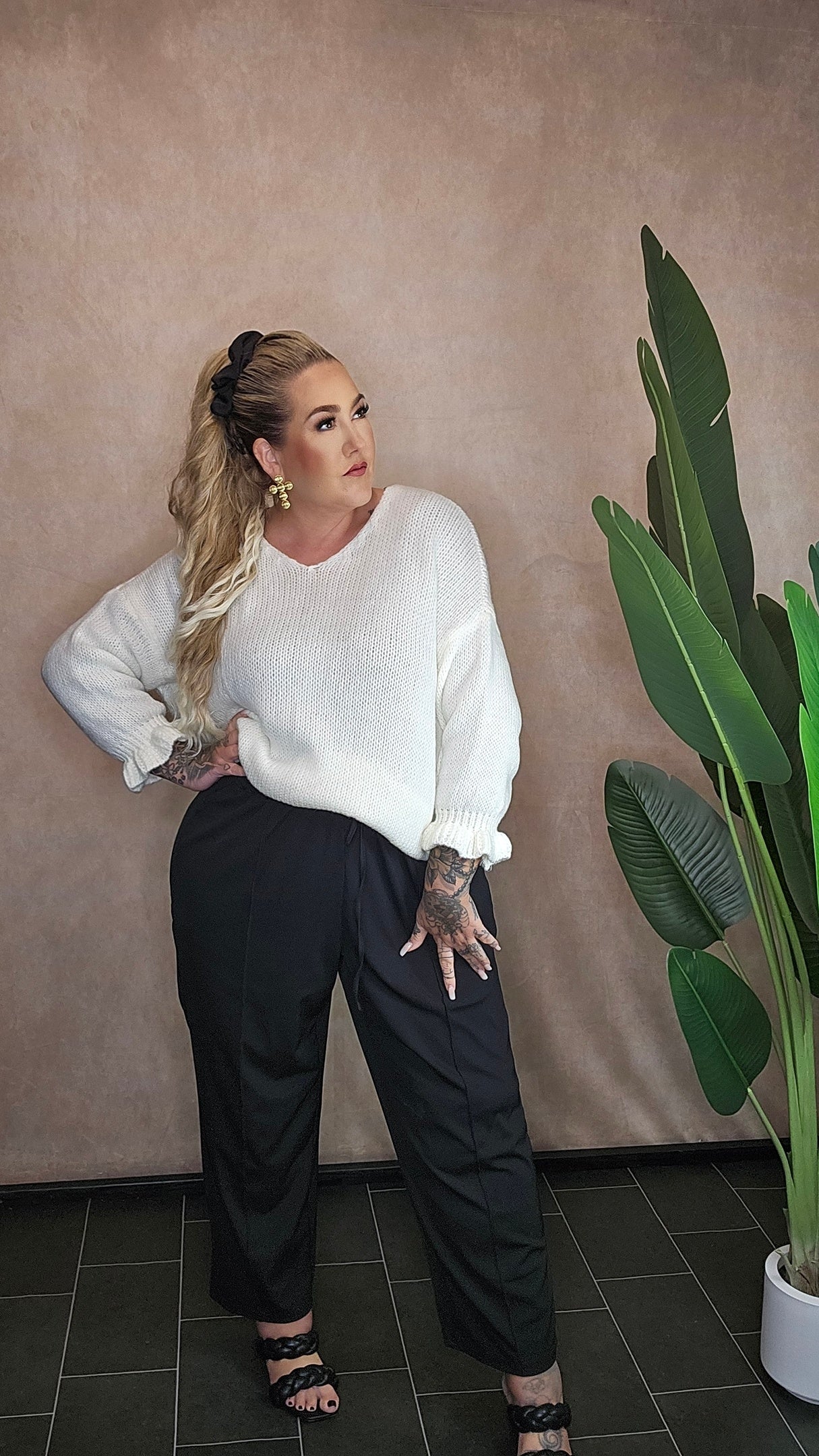 Styling-Tipp: Kombiniere den Pullover ganz klassisch mit einer schwarzen High-Waist-Hose, um die Rüschenbündchen und den lockeren Fall des Strickes in den Vordergrund zu stellen. Mit goldenen Statement-Ohrringen, wie unser Model, verleihst du dem Look einen luxuriösen Touch.