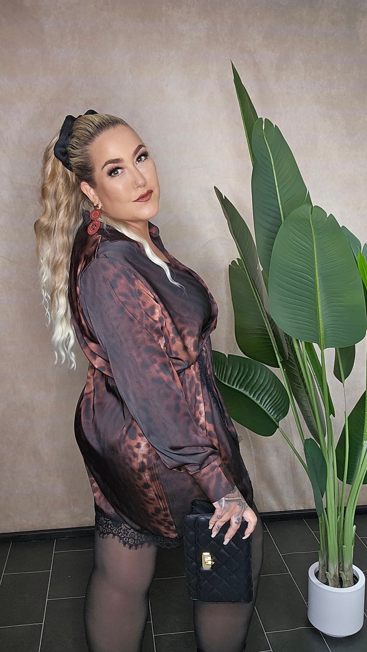 Das "Wild Heart" Wickelkleid ist dein neues Lieblings-Piece für jeden Tag! 🖤 Die schmeichelhafte Wickel-Silhouette passt sich perfekt deiner Körperform an, betont deine Taille und zeigt einen eleganten V-Ausschnitt. Das Leo-Print verleiht dir einen coolen, rockigen Vibe – und das Beste? Die feine schwarze Spitzenborte am Saum! ✨ Sie bringt eine sinnliche, verführerische Note ins Spiel und macht dich zum absoluten Hingucker. Kombinier es mit deinen Lieblings-Boots für einen lässigen Look oder mit High Heels für elegante Abende.